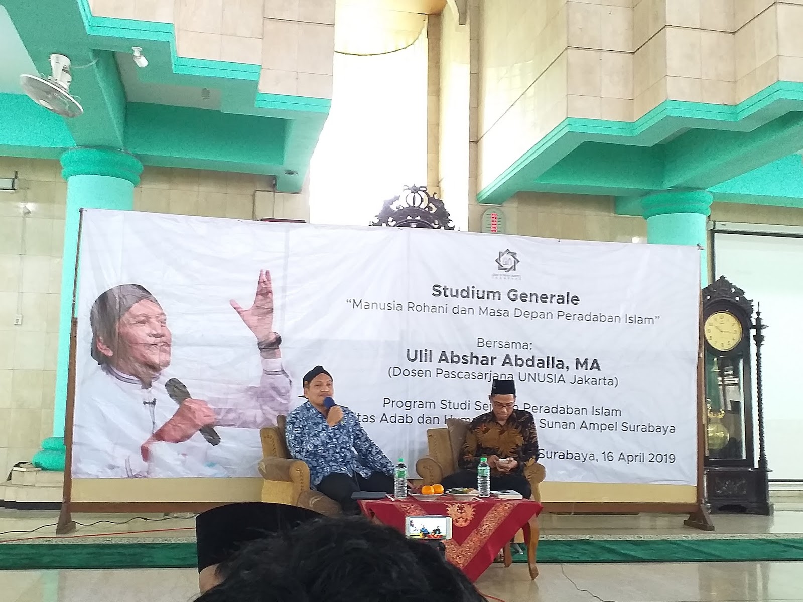 Senin, 16 April 2019 jurusan Sejarah Peradaban Islam Fakultas Adab dan Humaniora menggelar acara stadium general. Acara yang diselenggarakan di Masjid Ulul Albab UIN Sunan Ampel Surabaya ini dibuka secara langsung oleh bapak Agus Aditoni selaku dekan Fakultas Adab dan Humaniora pada pukul 10.00 WIB. Dalam stadium general kali ini, jurusan Sejarah Perdaban Islam mengusung tema “Manusia Rohani dan Masa Depan Peradaban Islam” dengan menghadirkan Ulil Abshar Abdallah sebagai pemateri dan dengan dipandu oleh bapak Muhammad Khadafi, Kepala Jurusan Sejarah Peradaban Islam. Ulil Abshar Abdallah atau yang akrab dipanggil dengan Gus Ulil sendiri merupakan dosen pasca sarjana Universitas Nahdlatul Ulama Indonesia (UNUSIA) Jakarta.